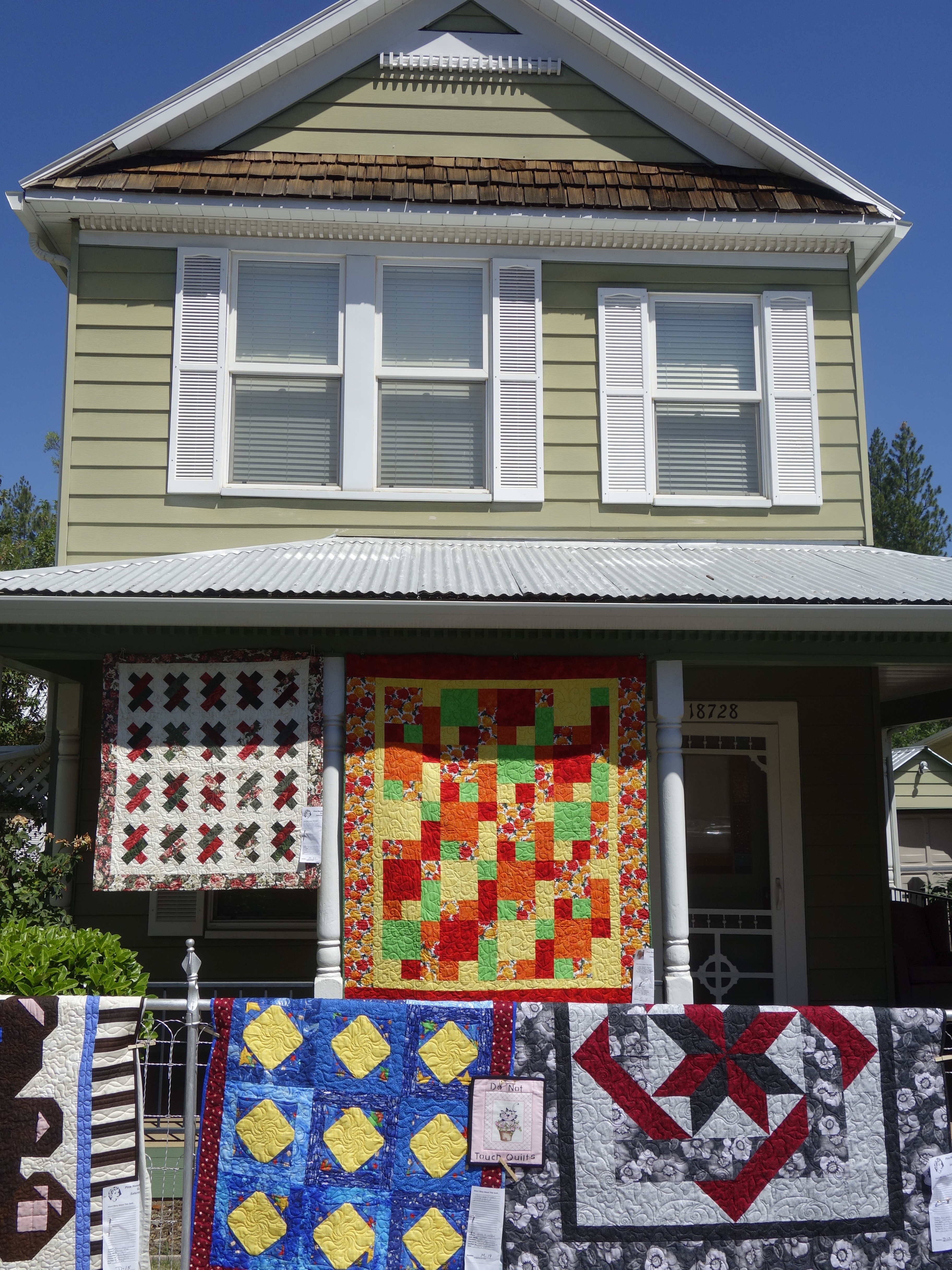 Alex went on a quilt stroll. Groveland is a small town 26 miles outside of Yosemite National Park in the foothills of California. It still has the charm of a Western mining town. The local guild dressed the town in quilts. Here is a view of the quilts and the town.